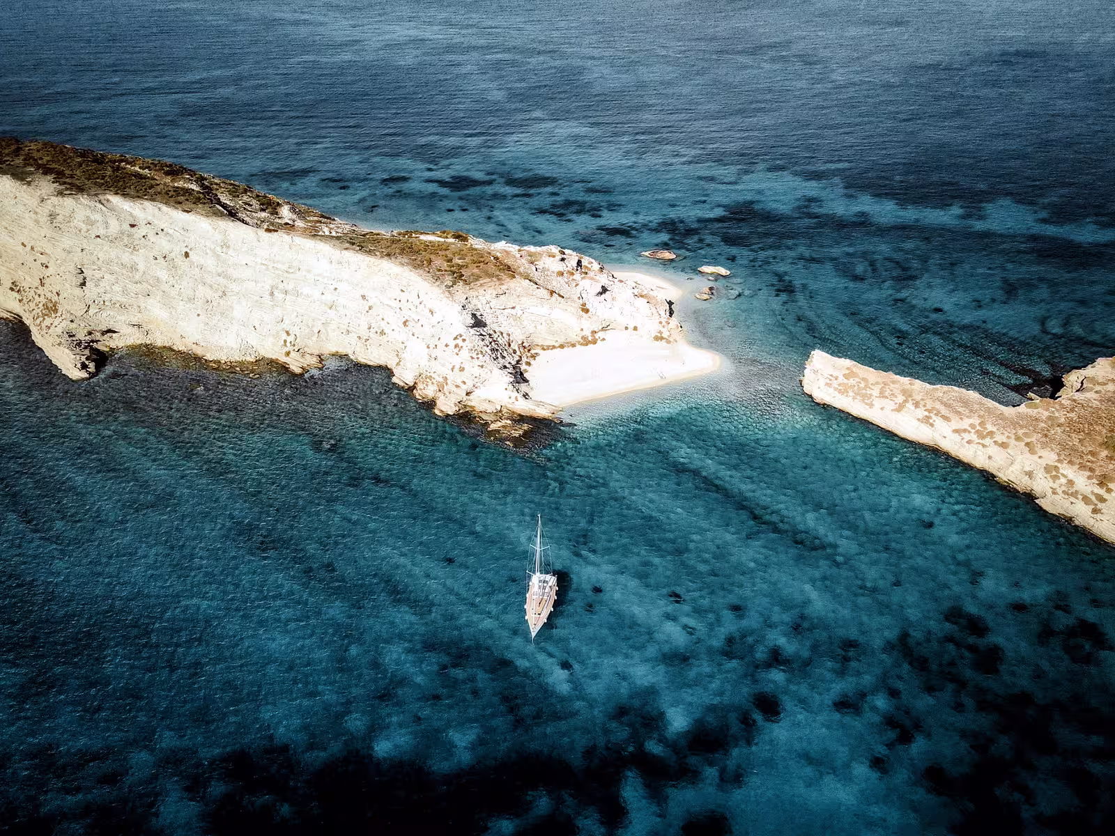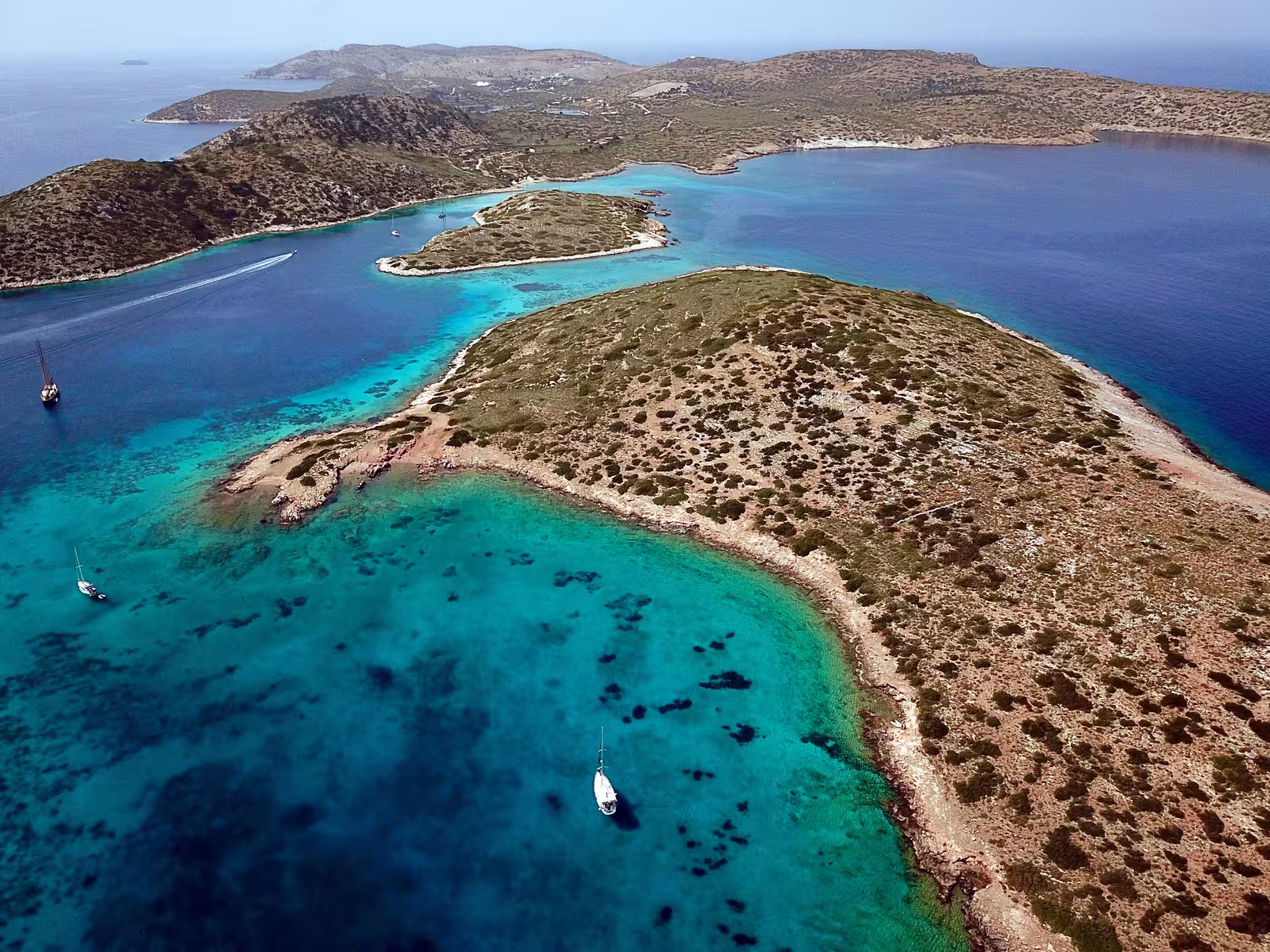 You will find full protection from the Meltemi and a decent area with sandy bottom that provides solid holding, all in shallow crystal clear waters; anchor anywhere in 4 – 8 m, Lat Long, where you see either sand or a thin layer of weed.
