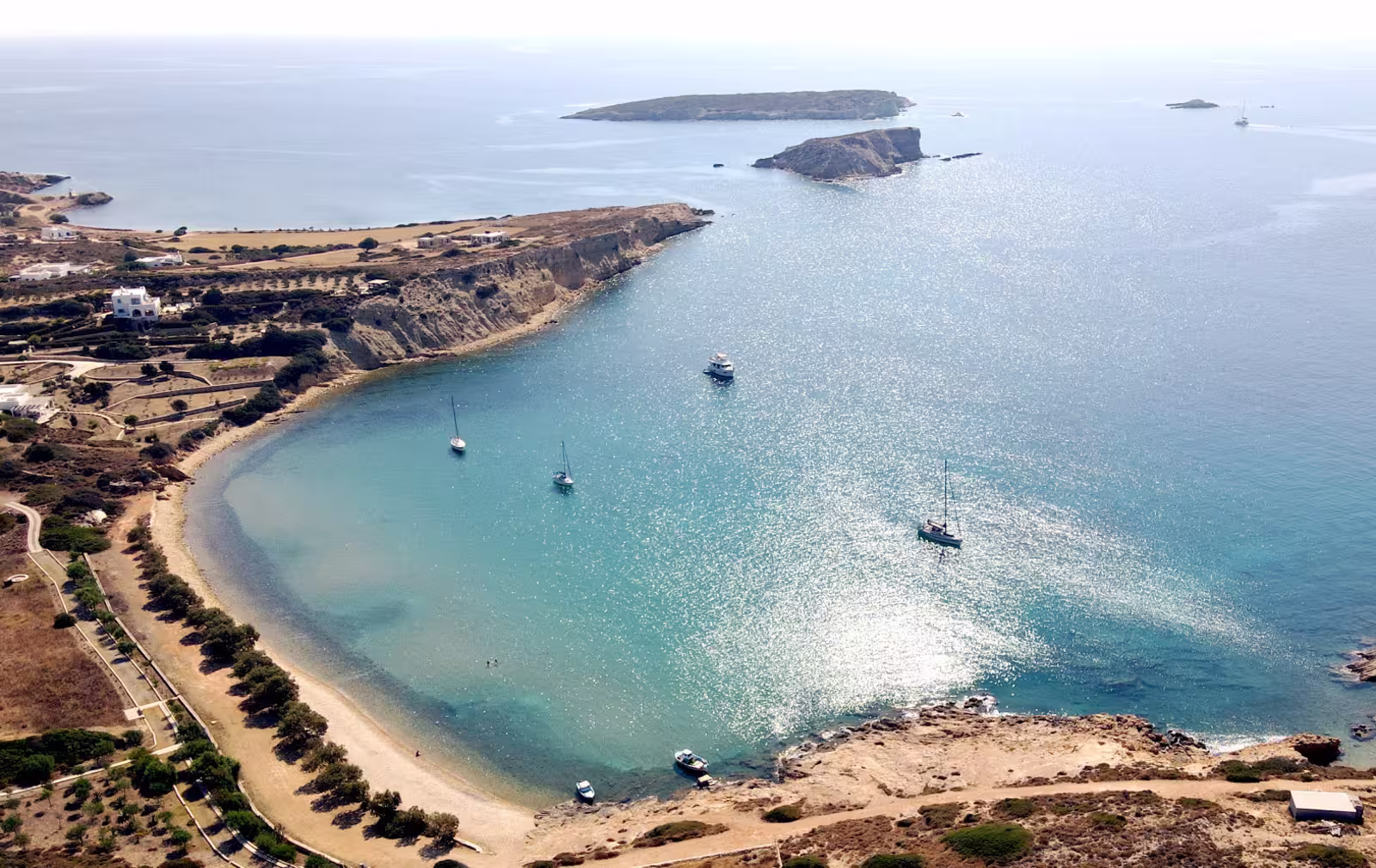 The bay is Meltemi-proof, but winds will funnel between the hills with gusts alternating NW and N; reportedly better holding than Spilias, again sand and a bit of weed and small pebbles;