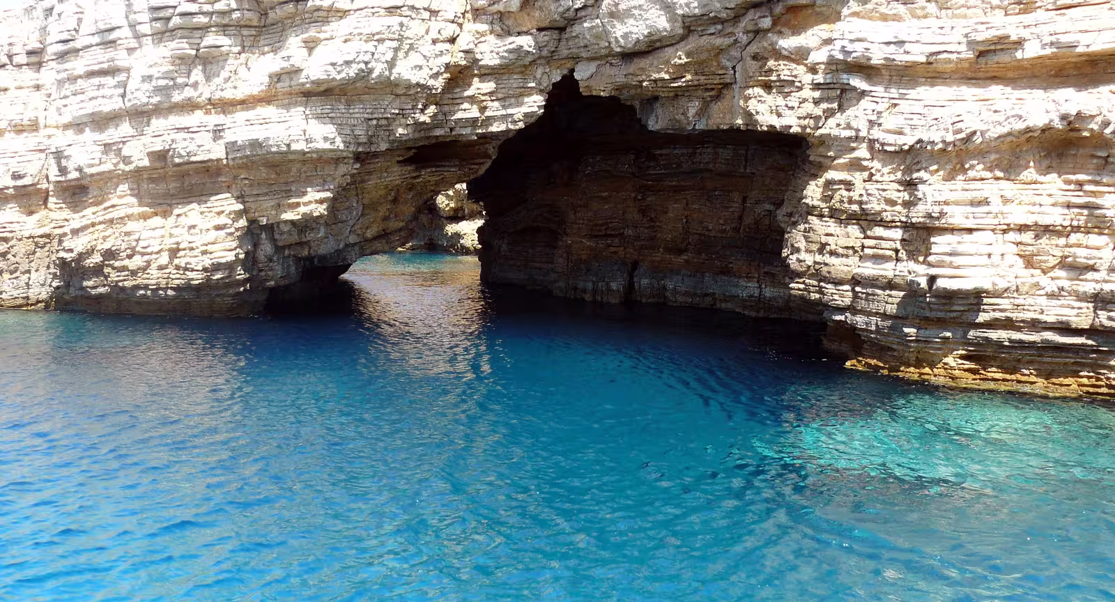 The isle of Makronísi (Lipsi) - Μακρονήσι offers a 2 m deep circular lagoon and a cave to swim through, which makes this a seriously popular venue – despite this, you will be (mostly) alone before 10:00 and after 16:30.